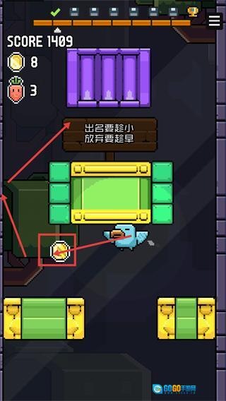 3、遇到提示牌【出名要趁早-放弃要趁早】时,继续操控小鸟收集场景内的【金币】,助力【SCORE】进一步提升。