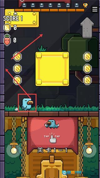 1、进入【关卡1-1】操控蓝色小鸟,跟随【TAP-TAP】提示操作,收集场景中的金币,积累【SCORE】提升关卡得分。