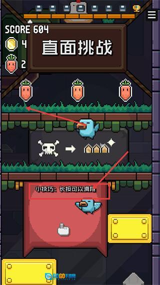 2、在【直面挑战】环节,利用小技巧【长按可以滑翔】操控小鸟,避开骷髅陷阱,收集场景中的【胡萝卜】提升资源数量。