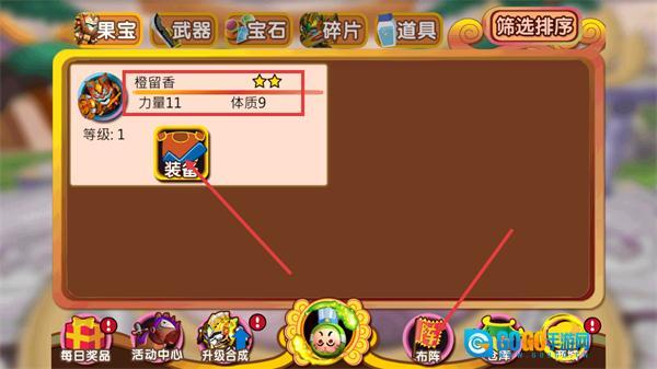 1、在果宝界面中,找到等级1、力量11、体质9属性的【橙留香】并关注,点击装备按钮为其配置装备,同时通过每日奖品、活动中心等入口来获取资源。
