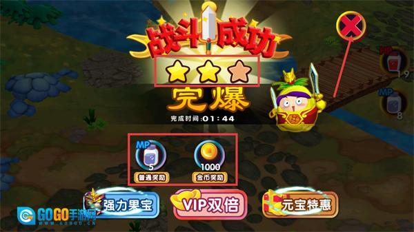 4、战斗胜利后可获得普通奖励——MP5以及金币奖励——1000,还能查看完爆评级和完成时间——01:44,可点击强力果宝等按钮来提升战力。