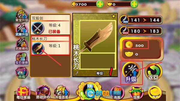 在武器界面,挑选桃木长刀(等级1),花费500货币点击升级按钮来增强它的属性,与此同时还能查看双股剑(等级4)是否处于已装备的状态。