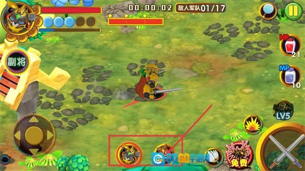2、战斗过程中注意观察敌人军队-01/17的进度情况,点击副将图标即可召唤副将帮忙参与战斗,通过方向控件来调整位置,同时利用HP-21和MP-10道具维持续航。