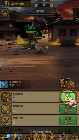 2、点击“开始战斗”按钮,通过点击“强化”功能提升英雄的攻击力,以此来挑战更多其他英雄。