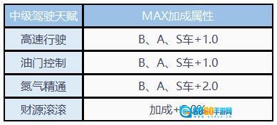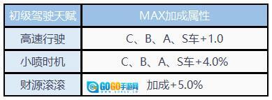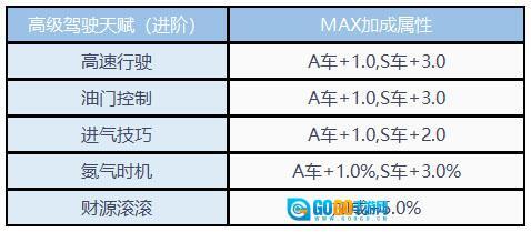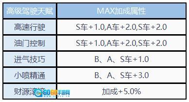 该阶段属于进阶版的高级驾驶天赋,解锁条件除了拥有高级驾照外,还要求角色等级达到40级。解锁后可获得高速行驶、油门控制、进气技巧、氮气时机以及财源滚滚这几项天赋。此阶段天赋仅适用于A车与S车,对其他级别车辆无加成效果,且重点强化了S车的天赋属性——除财源滚滚外,其余天赋对S车的加成幅度都相当高,能显著提升S车的性能表现。