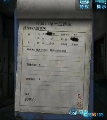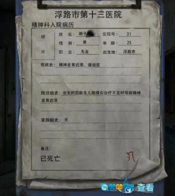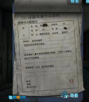 查看下面的病例,发现是肖医生的。用肖医生的id卡对准照片位置,就能将其变成探视申请表。回到大厅吧台,把申请表放进左边的纸盒里,就能再次进行探视。返回探视室后,查看右边的玻璃,这里会有小高能提示,按照提示查看他的眼睛,得到的数字就是保险箱密码——顺时针75度、逆时针20度、顺时针60度。按照这个顺序旋转中间位置的保险箱,打开后就能拿到六葬菩萨的金像,拿到金像时会再次出现小高能!再次回到走廊,进入左边的房间,将金像放在镜子前面,随着八音盒的声音响起,新的npc出现了。随着剧情推进,再次来到奘铃村,本章就此结束。