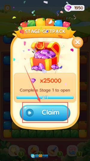 4、领取礼盒:当分数累计至1950,界面弹出STAGE GIFTPACK,点击“Claim”领取25000奖励并解锁下一关。