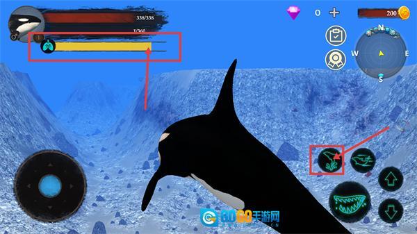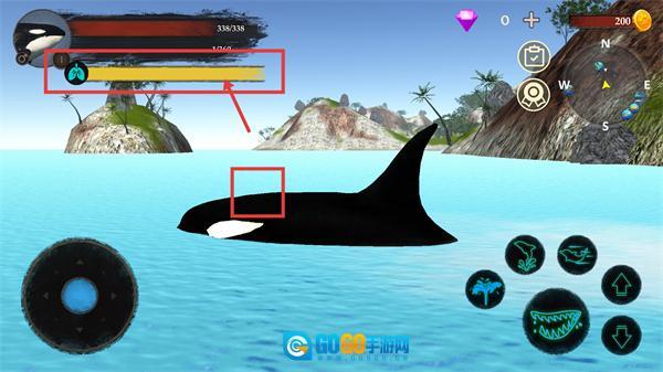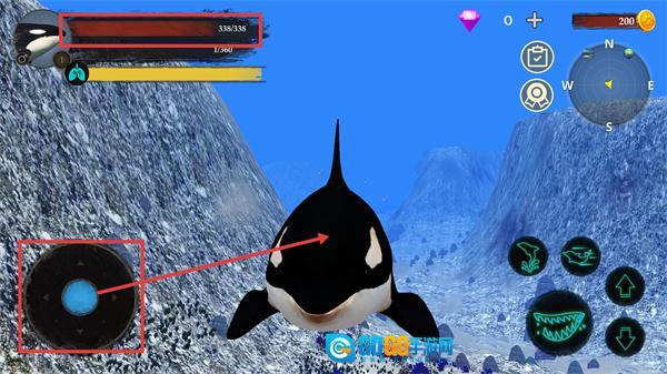 2、借助左侧的【摇杆】来操控虎鲸的移动,留意左上角显示的【338/338】生命值以及氧气条,保证自身状态平稳,从而能够持续探索这片海域。