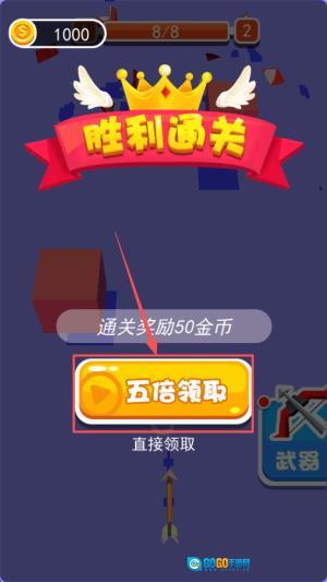 4、通关领奖:当武器进度完成度达到8/8且界面显示“胜利通关”时,点击“直接领取”按钮即可获得50金币的奖励。