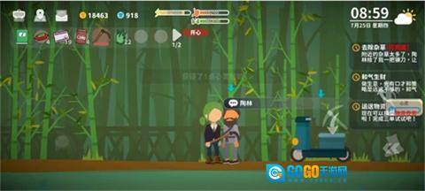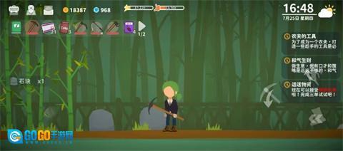 竹林左边有块石头,它会挡住人物的移动路线,得用十字镐把它敲碎才能拿到石块。目前还没找到铁矿石的位置。