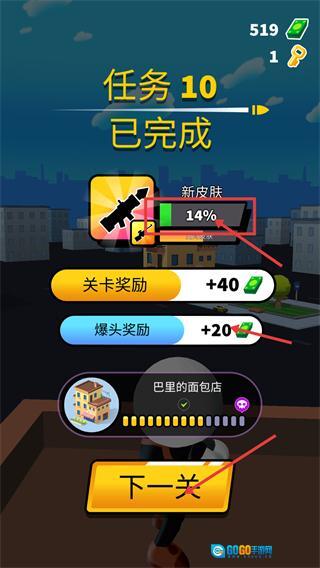 4、完成任务后可领取【关卡奖励+40】与【爆头奖励+20】,新皮肤解锁进度将推进14%,点击【下一关】即可开启全新挑战。
