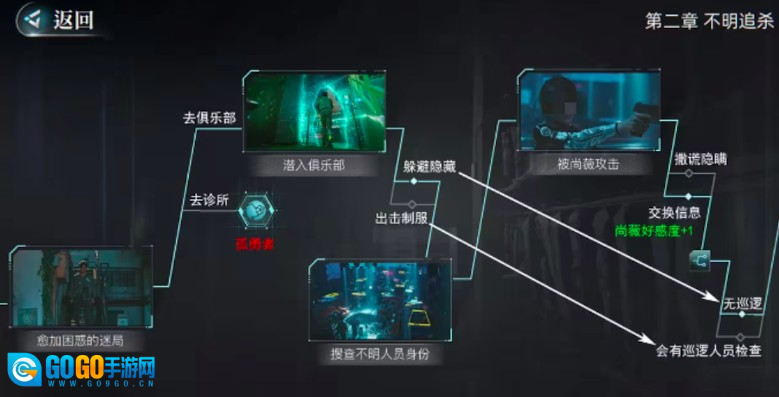 此时小编建议玩家需要回去查找线索,小编也将查找线索的相关内容和大家详细分享一下,如果你去诊所,那么就挂掉。如果去俱乐部的话,遇到保安玩家记得选择躲避隐藏,不过在后续遇到上位的时候就不会触发保安巡逻的故事情节,如果你要是选择初级制服,后续就可以触发保安巡逻情节,并且主角与尚微还可以一起躲避保安,而且通过与他交换信息则可以在游戏当中大大提高上微对主角的好感度,使角色的攻略难度大大下降,所以小伙伴们可以尝试一下去俱乐部制服保安。