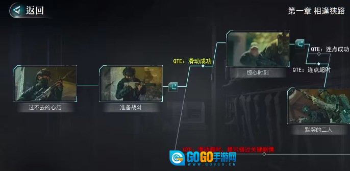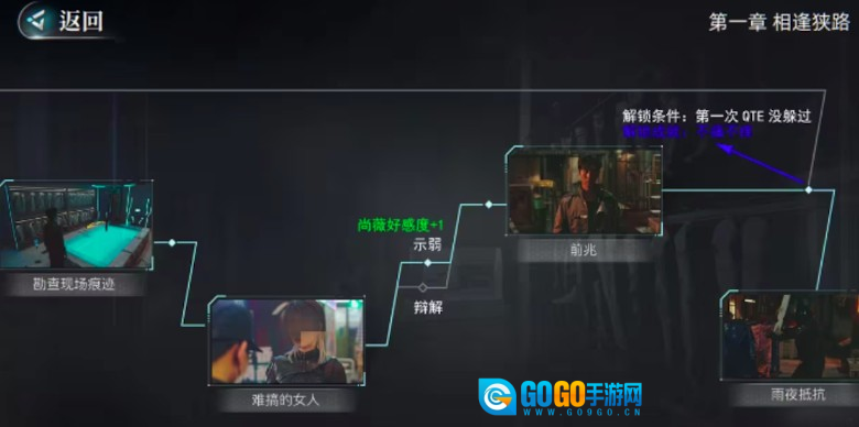 首先聊聊序章,其实序章没什么特别需要留意的点,主要就是推进剧情,接下来我就从第一章“狭路相逢”开始讲起。玩家在游戏里会触发“过去的回忆”这个章节,第一个QTE需要完成滑动操作,要是没完成可能会错过不少关键剧情,不过我测试了一下,不滑动也不会有太大影响,但很多重要元素或许就没法收集到了。