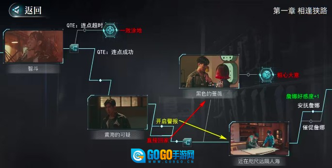 接下来的步骤是:若选择开启警报回家,需找到詹娜帮忙找人——选“安抚詹娜”可提升她对主角的好感度,选“催促詹娜”则会大幅降低好感度;若选择直接回家,会遇到女性角色尚威,能获取案件相关信息,但会解锁被黑衣人刺杀的场景(此场景易导致失败)。不过小编发现,要解锁“黑色蔷薇”章节剧情,需两次选择“直接回家”选项才行。