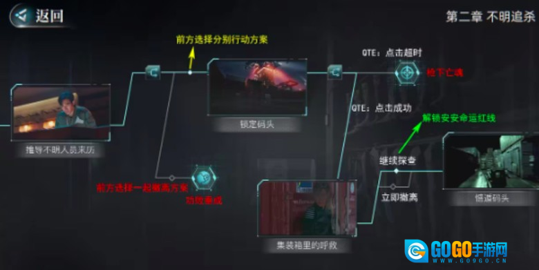 接下来又进入了吊牌线索环节,玩家在前方同样会面临两个不同的选择。第一个选择是分头行动,第二个选择是共同撤离。若选择分头行动,就能成功触发QTE;要是选择继续探查,便会解锁安安的命运红线。