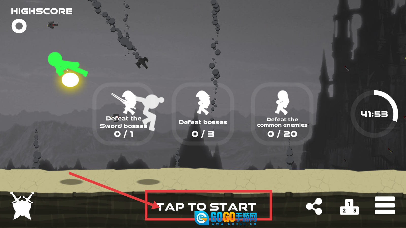 1、点击【TAP-TO-START】按钮启动游戏,接下来你需要完成挑战剑boss、消灭普通敌人等任务,以此积累更高的分数。