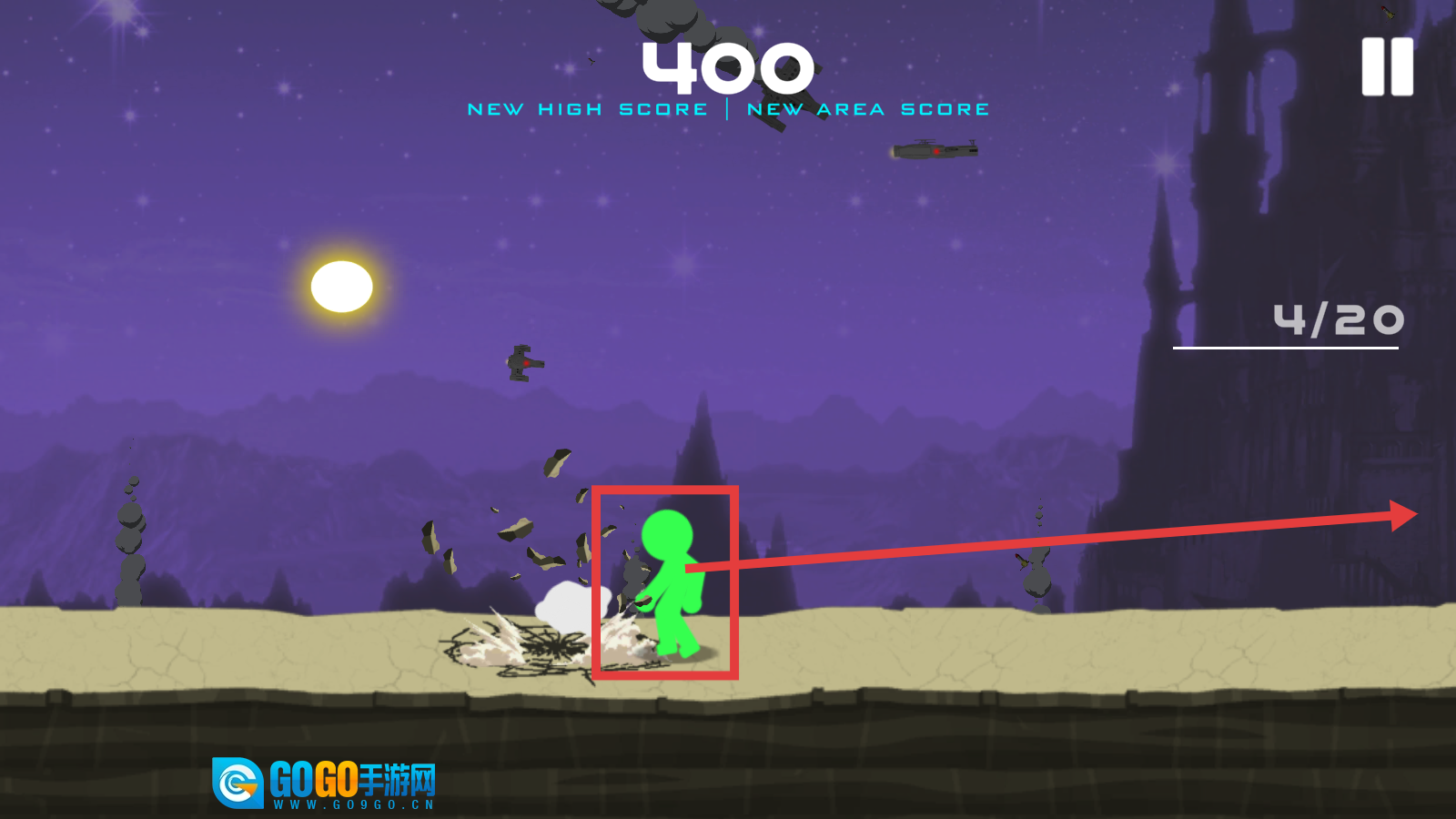 操控绿色角色向右移动,击败普通敌人可获得400分,以此提升区域得分进度。
