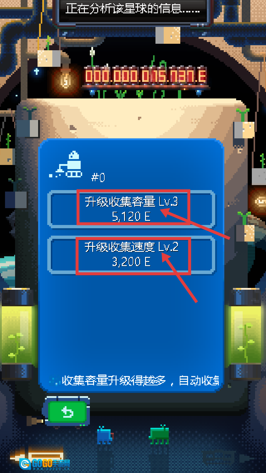 3、进入升级界面后,建议优先对收集容量(例如提升至Lv.3,需消耗5,120E)与收集速度(例如提升至Lv.2,需消耗3,200E)进行升级操作,以此提高资源获取的效率,从而为后续的探索活动奠定坚实基础。