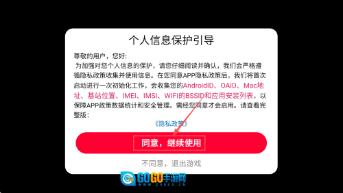 1、同意隐私政策:游戏启动后,请仔细阅读隐私政策内容,若确认无误,点击“同意,继续使用”按钮以表示同意。