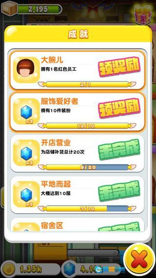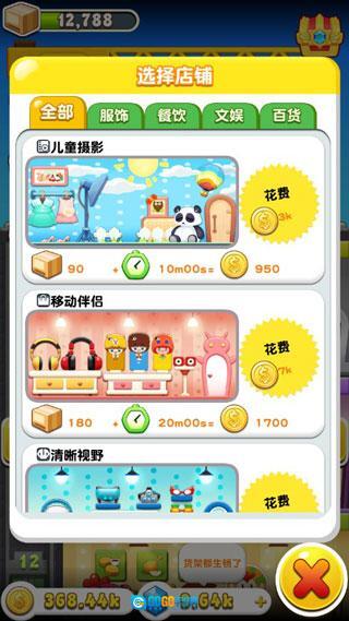 普通商铺里主要涵盖服饰、餐饮、文娱和百货等类型,不过类型更为丰富,并且会随着楼层的提升逐步解锁,同时仅需消耗金币就能开启。