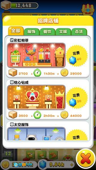 招牌店铺涵盖服饰、餐饮、文娱和百货等类型,解锁这些店铺需要消耗钻石。