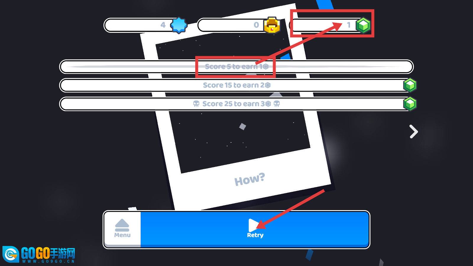 4、完成挑战后,你可以点击【Retry】按钮重新尝试,与此同时还能查看【Score-5-to-earn-1Ⓜ】这类奖励的进度情况,以此来积累绿色宝石资源。