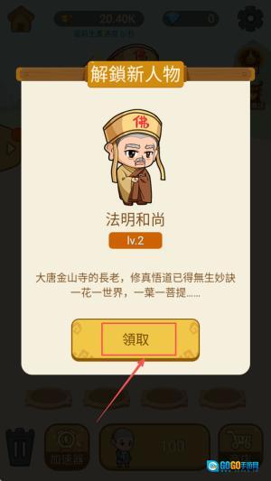 4、解锁“法明和尚”后,点击领取就能让他加入队伍,助力你继续挑战更高难度的关卡。