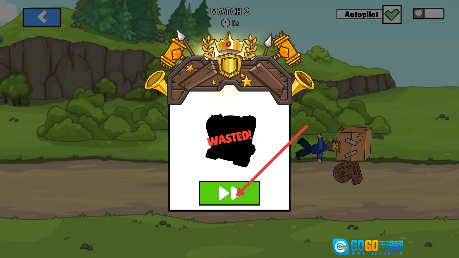 4、要是对战失败后出现【WASTED!】的提示,就点击绿色按钮重新尝试,同时总结失败的缘由,调整战车配置或者战术之后再次挑战。