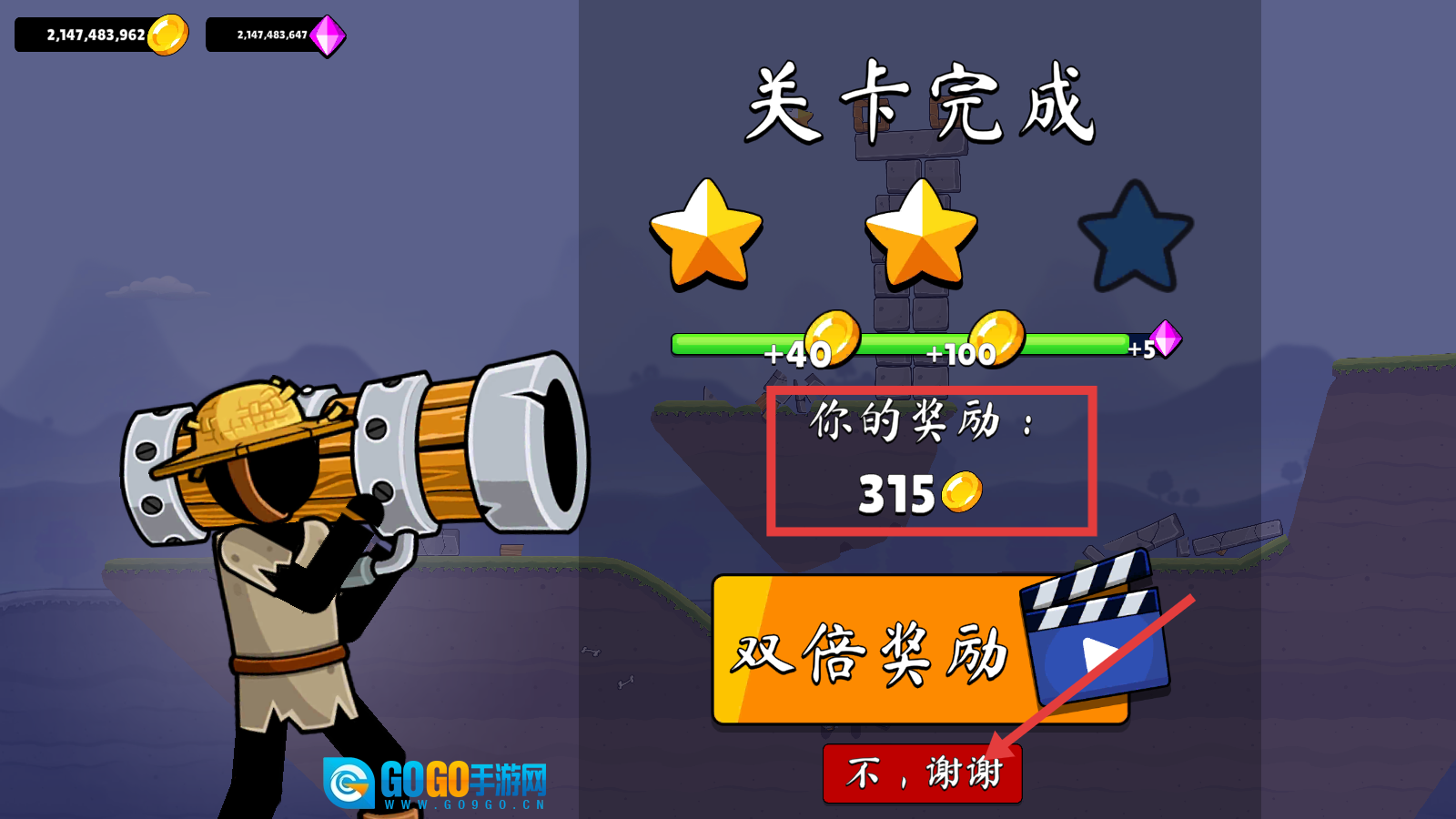 4、完成关卡后可领取【315金币】奖励,你可以选择“双倍奖励”,也可以点击“不,谢谢”来继续游戏。