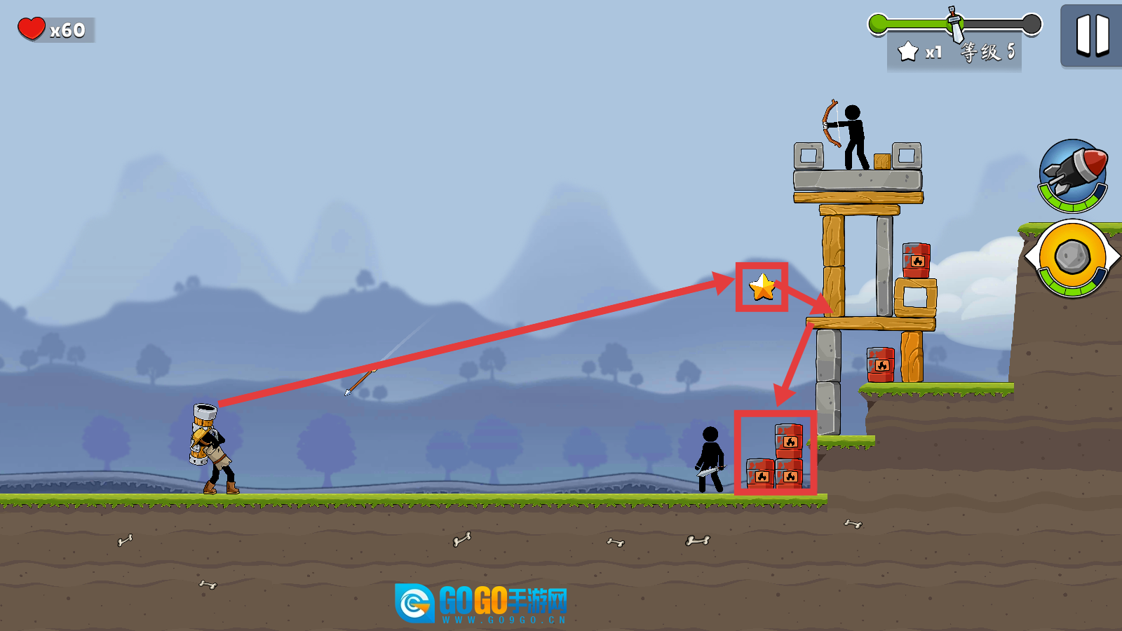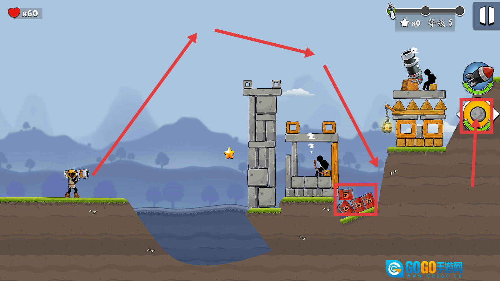 2、进入【等级5】关卡后,瞄准敌方的建筑与炸药堆,借助武器展开攻击,以此推动战斗的进行。