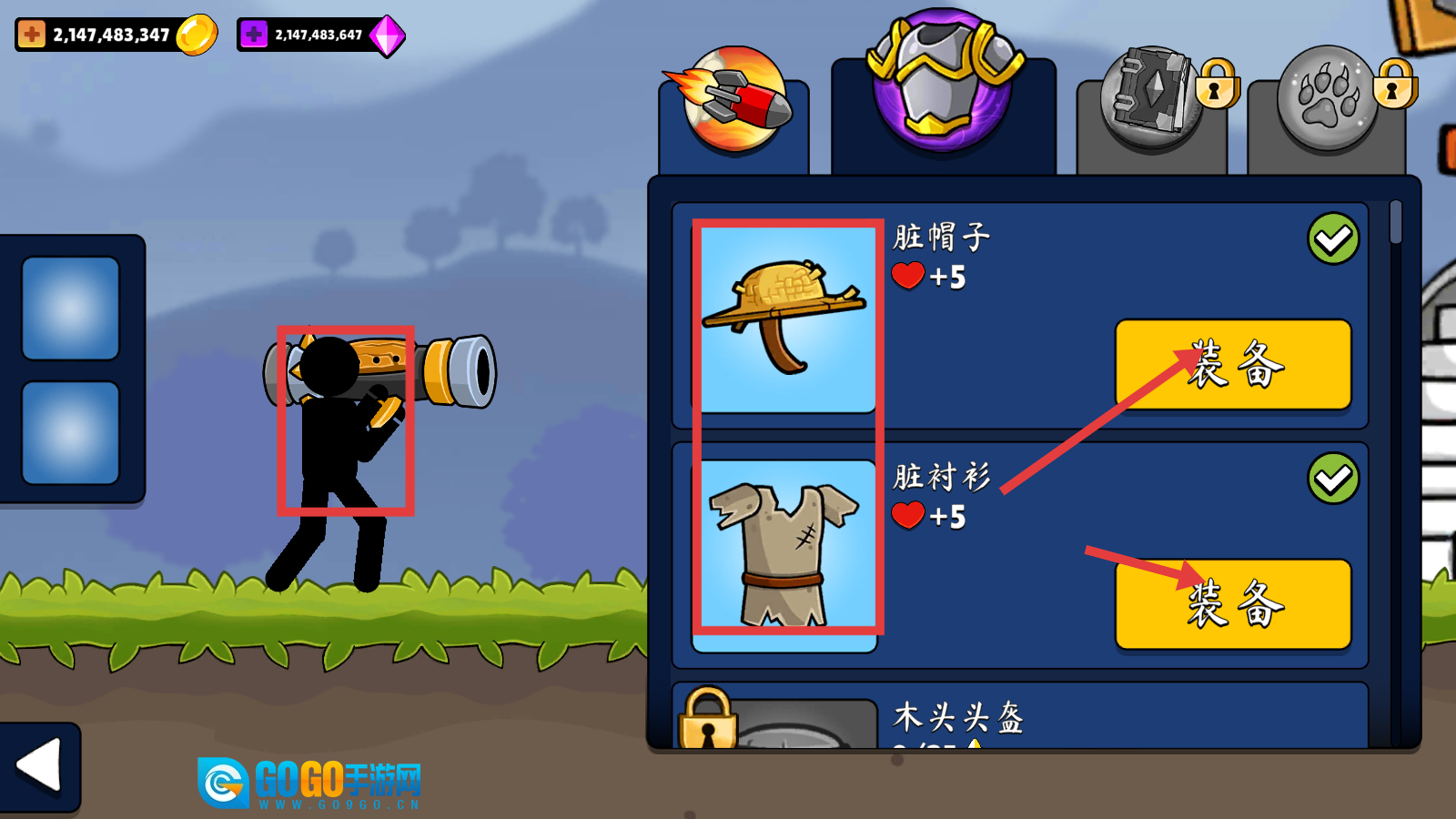 1、进入装备界面后,找到“脏帽子”和“脏衬衫”,点击它们对应的【装备】按钮,这样可以提升角色的生命值,让角色的生存能力得到增强。