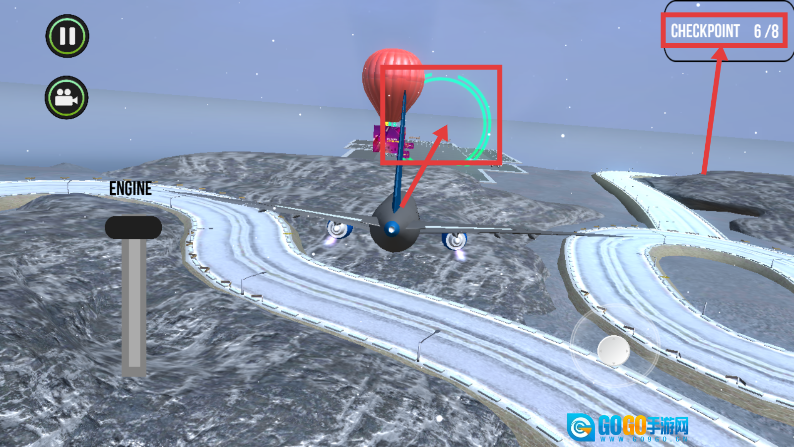 3、飞行过程中穿过绿色圆环检查点,注意查看【CHECKPOINT-6/8】的进度,一步步完成所有检查点。