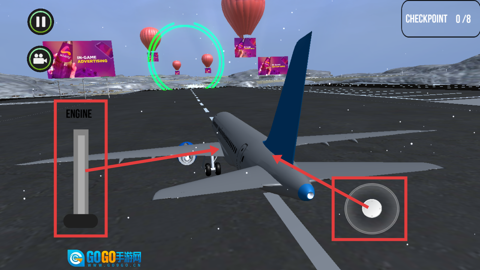 驾驶飞机时需留意【ENGINE】状态,借助操控按钮来操控飞机的移动,从而开启关卡推进流程。