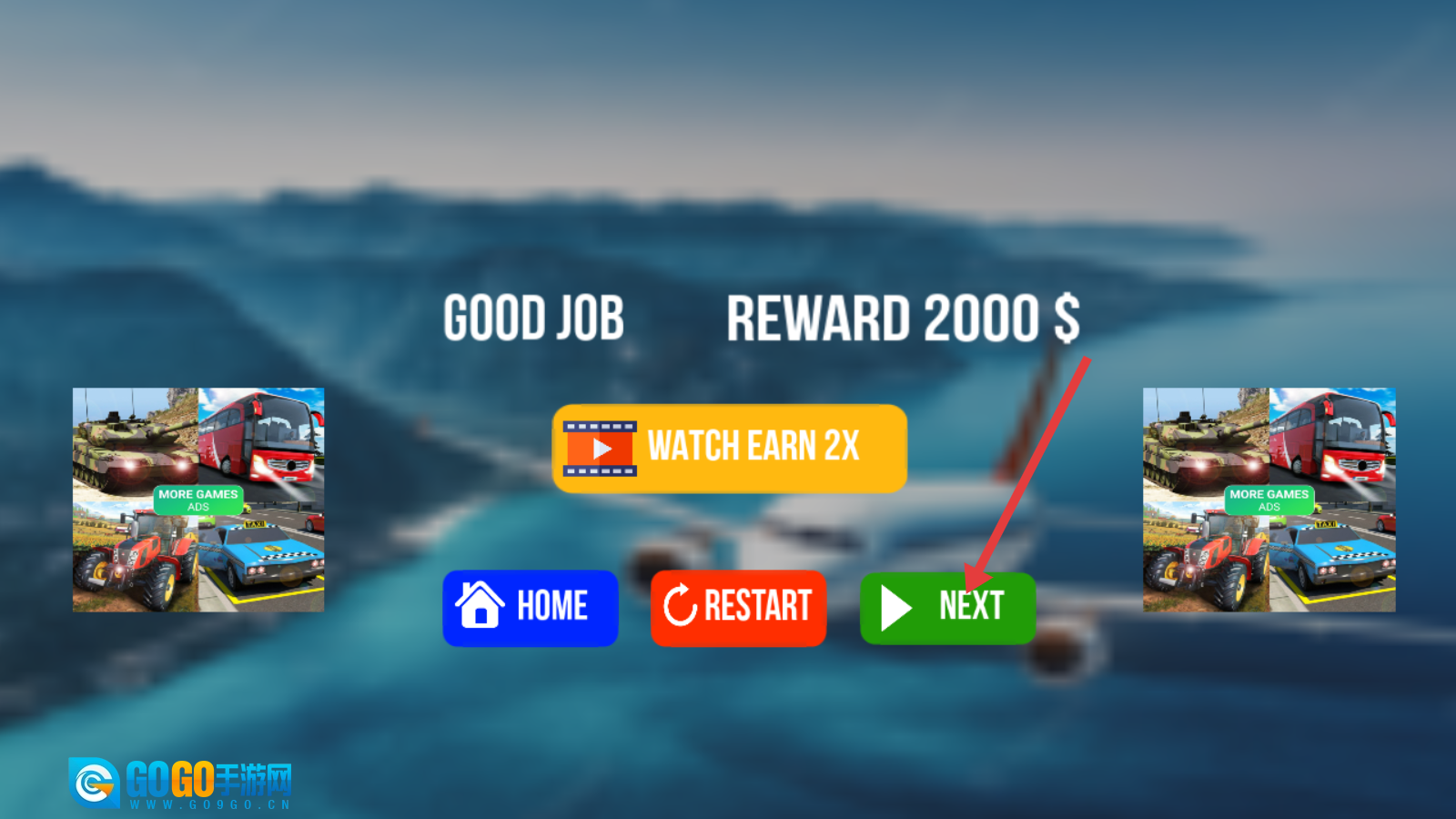 4、完成任务可获取【REWARD-2000$】,点击【NEXT】按钮进入下一关,也能选择观看广告来领取双倍奖励。