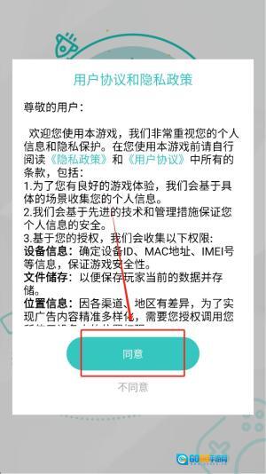 1、首先,阅读《用户协议和隐私政策》,点击“同意”按钮正式进入游戏。