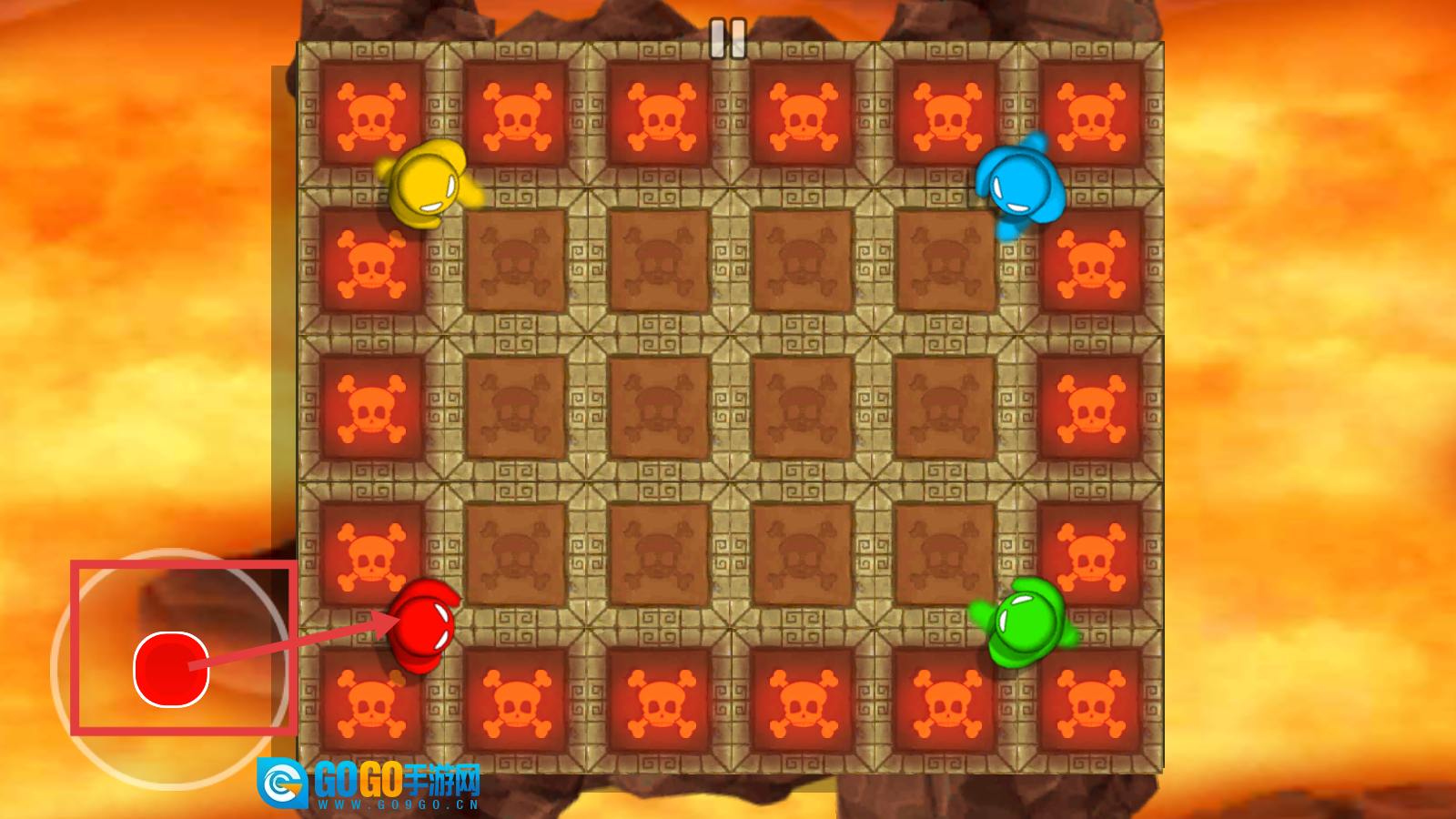 1、操作左侧的红色按钮,以此来控制【红色角色】的移动,要避开带有骷髅标识的危险格子,规划出安全的行进路线,开启生存挑战。