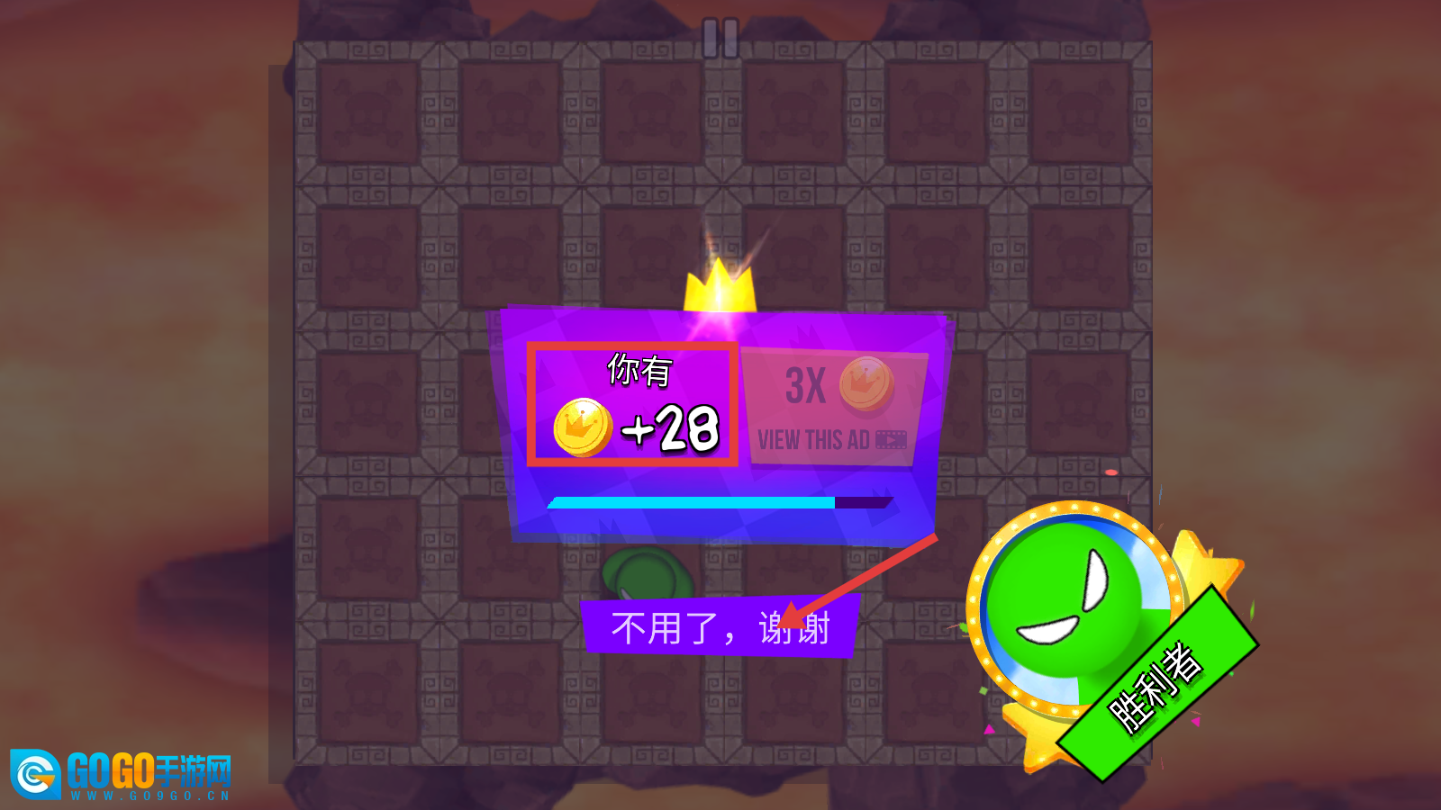4、获胜后会得到【+28-金币】的奖励,看到胜利者标识时,点击【不用了,谢谢】,接着挑战下一局。