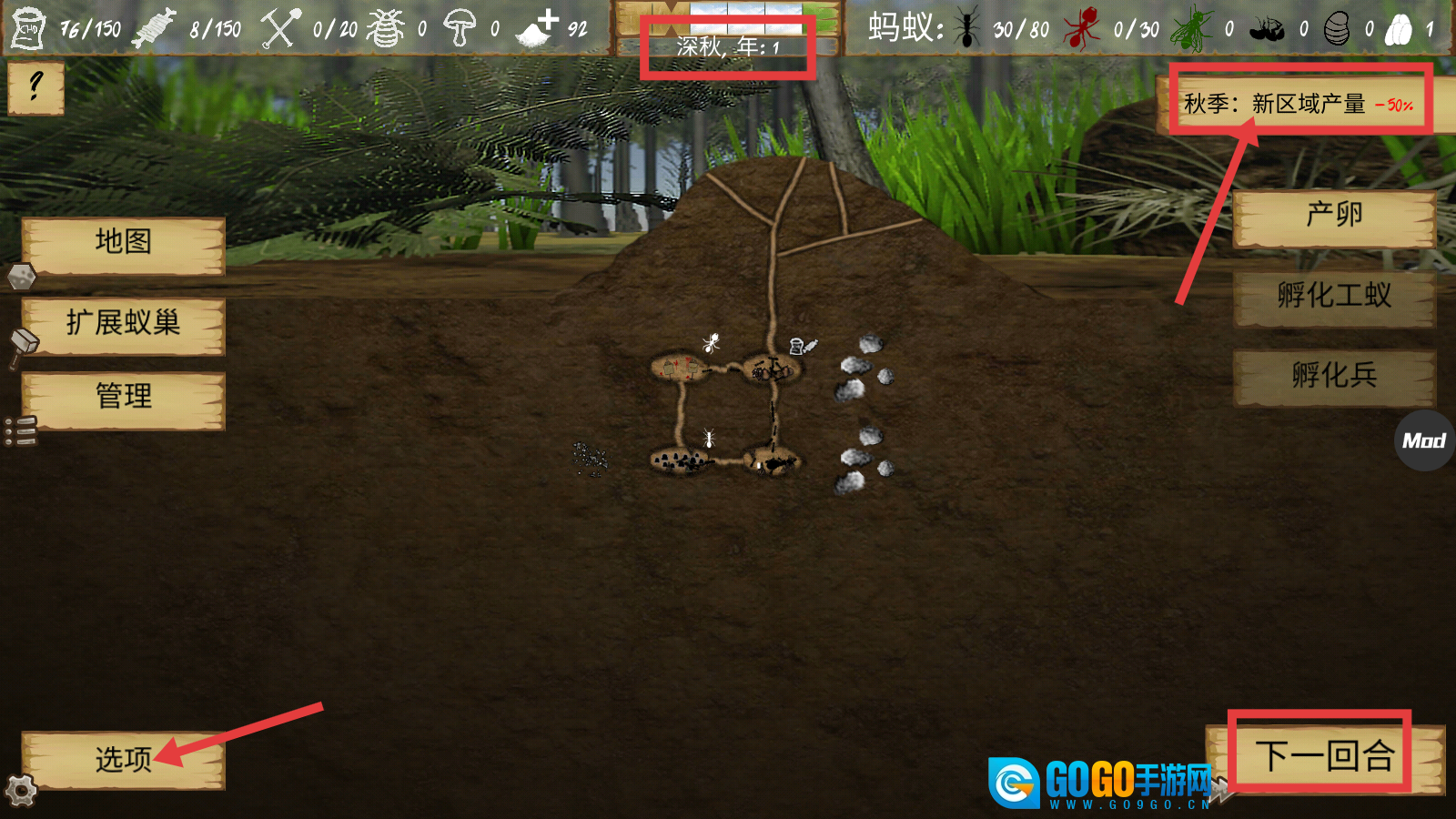 4、指挥蚂蚁探索地图并采集食物,通过点击地块来选择对应的蚂蚁类型执行任务,同时显示所有资源点的位置,以此提升觅食的效率和安全性。