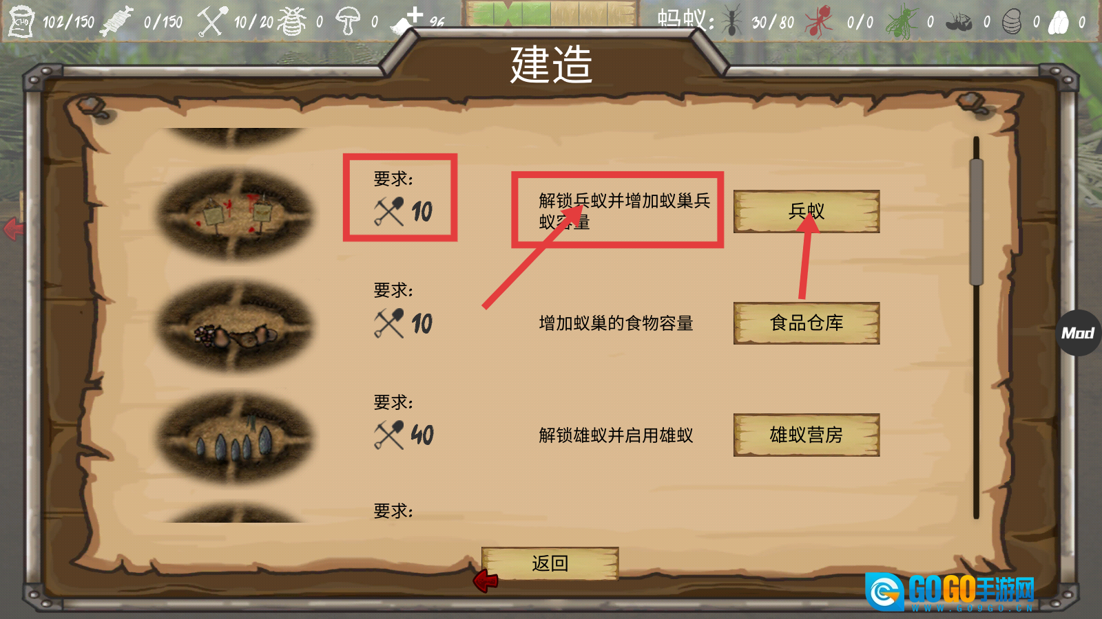 2、进入建造界面后,集齐10个工具,即可建造兵蚁建筑。该建筑能解锁兵蚁单位,同时增加兵蚁的容纳数量,从而有效提升整个蚁群的战斗能力与防御水平。