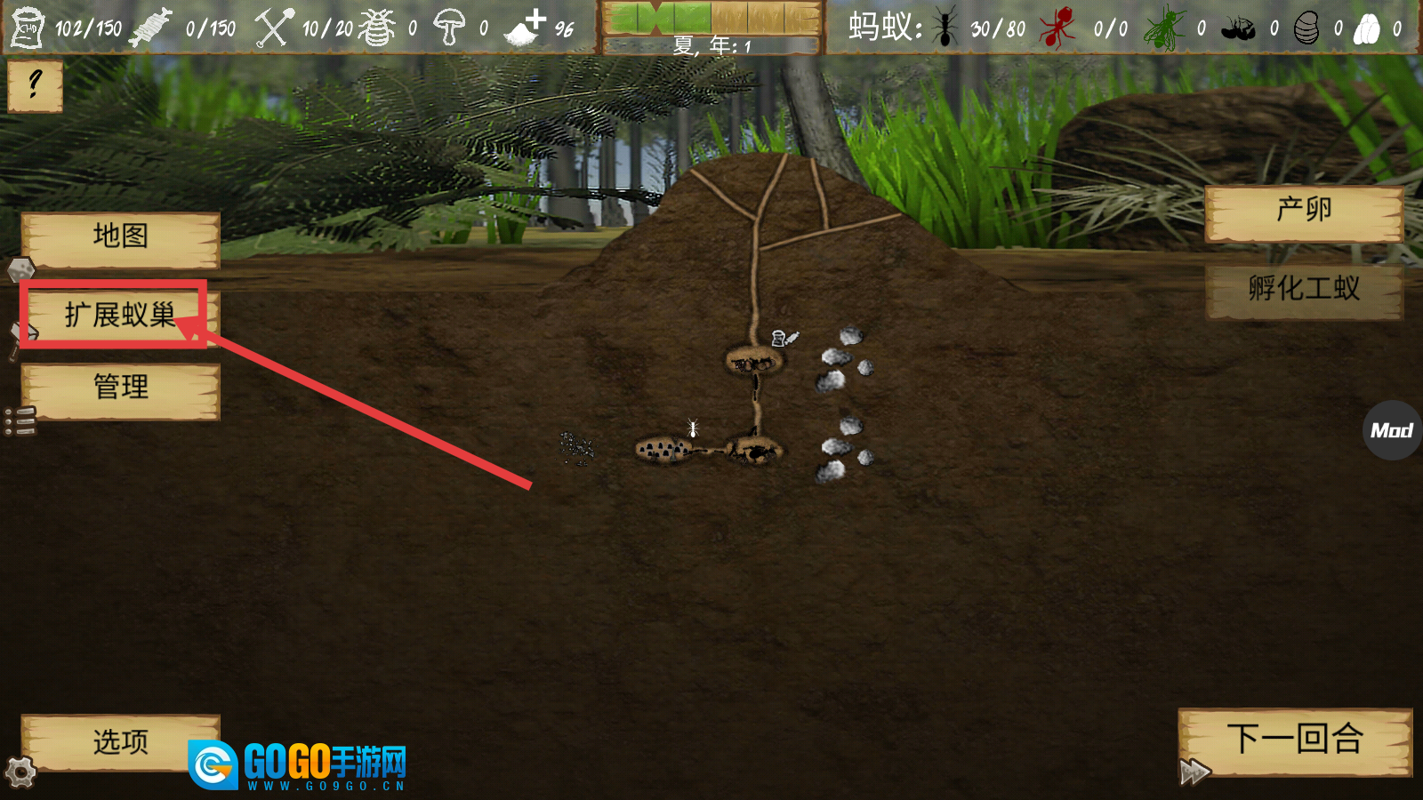 1、点击【扩展蚁巢】选项,进入建筑规划界面,对蚁巢的结构进行规划设计,以此为后续的建筑搭建和蚁群发展筑牢根基。