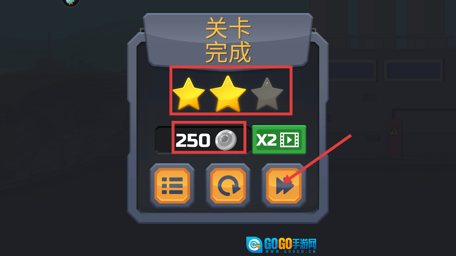 4、完成关卡后可获得星级评定以及【250】银币,点击箭头图标进入下一关,通过积累资源来解锁更多关卡内容。