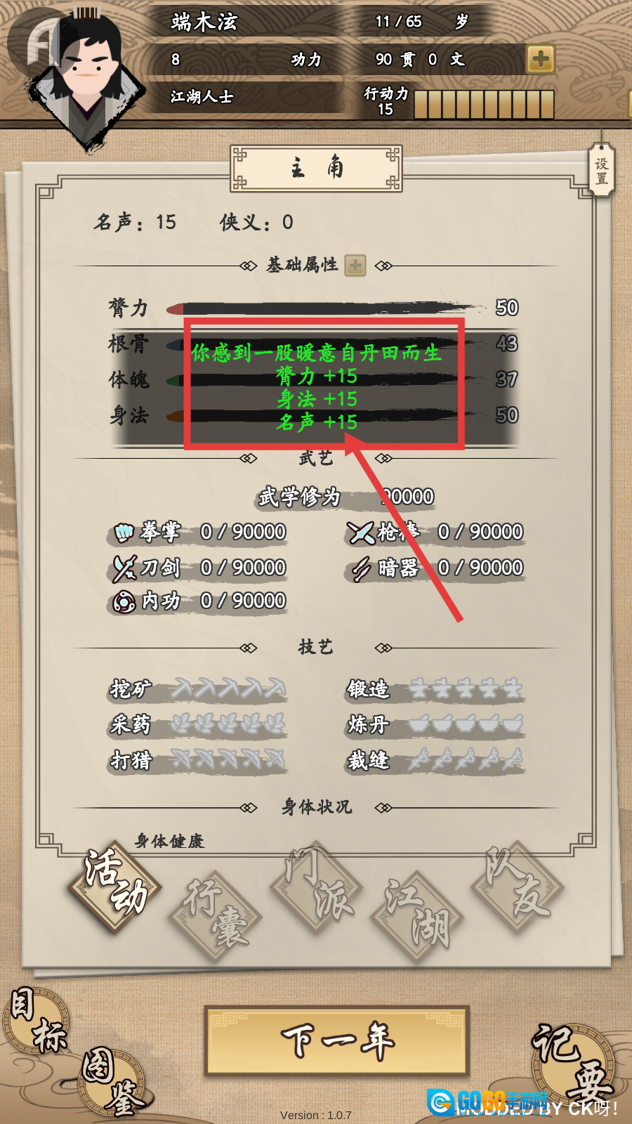 4、服用灵丹后,可获得【膂力+15】【身法+15】【名声+15】,大幅提升角色基础属性。