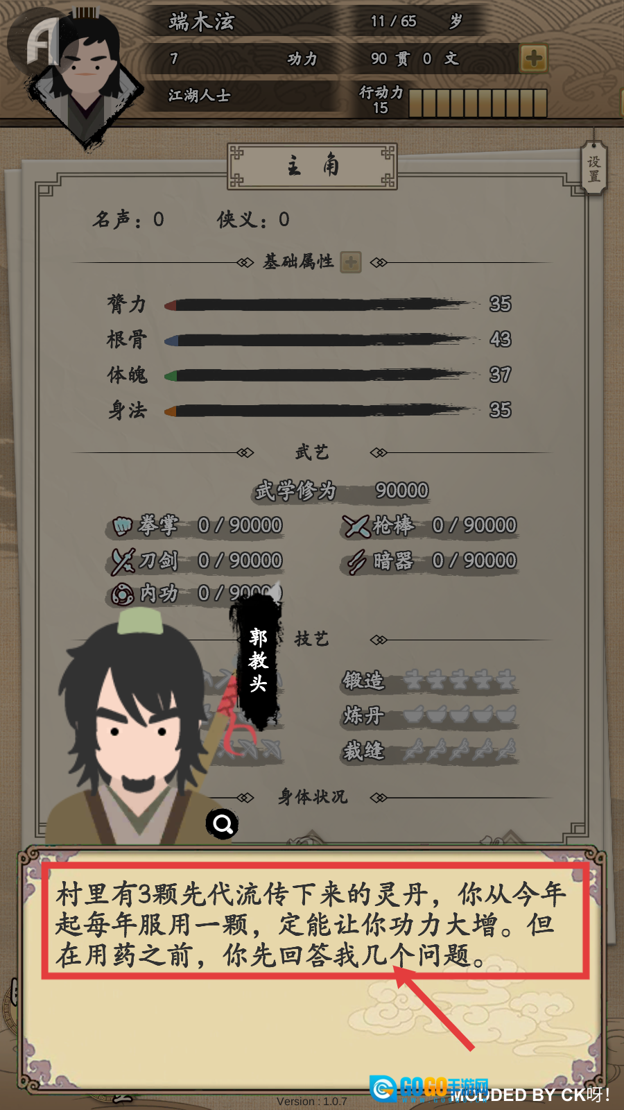2、按照郭教头提示,准备服用村里先代流传的灵丹,需先完成其提问以助力功力大增。