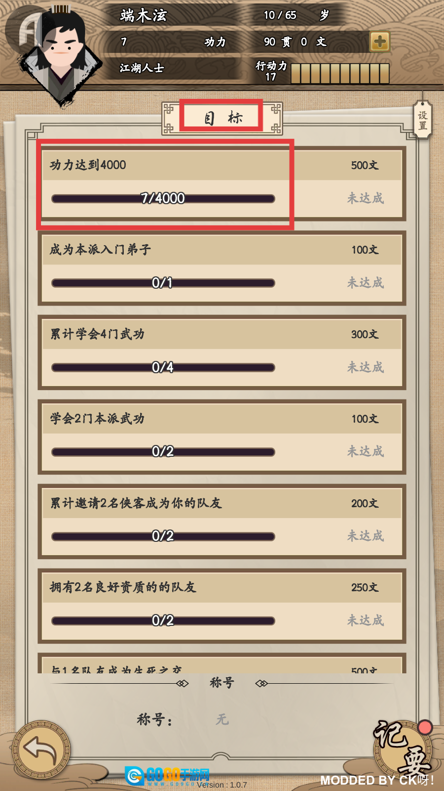 1、关注【目标-功力达到4000】进度,积极练功推进7/4000的进度,达成可获500文奖励。