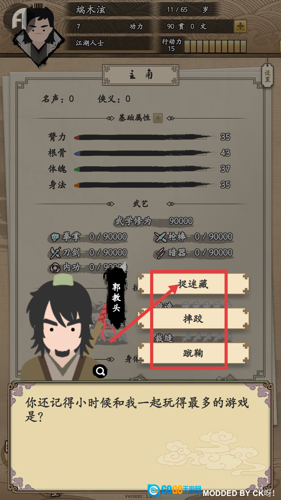3、回答郭教头关于小时候游戏的问题时,选择【捉迷藏】,为服用灵丹创造条件。