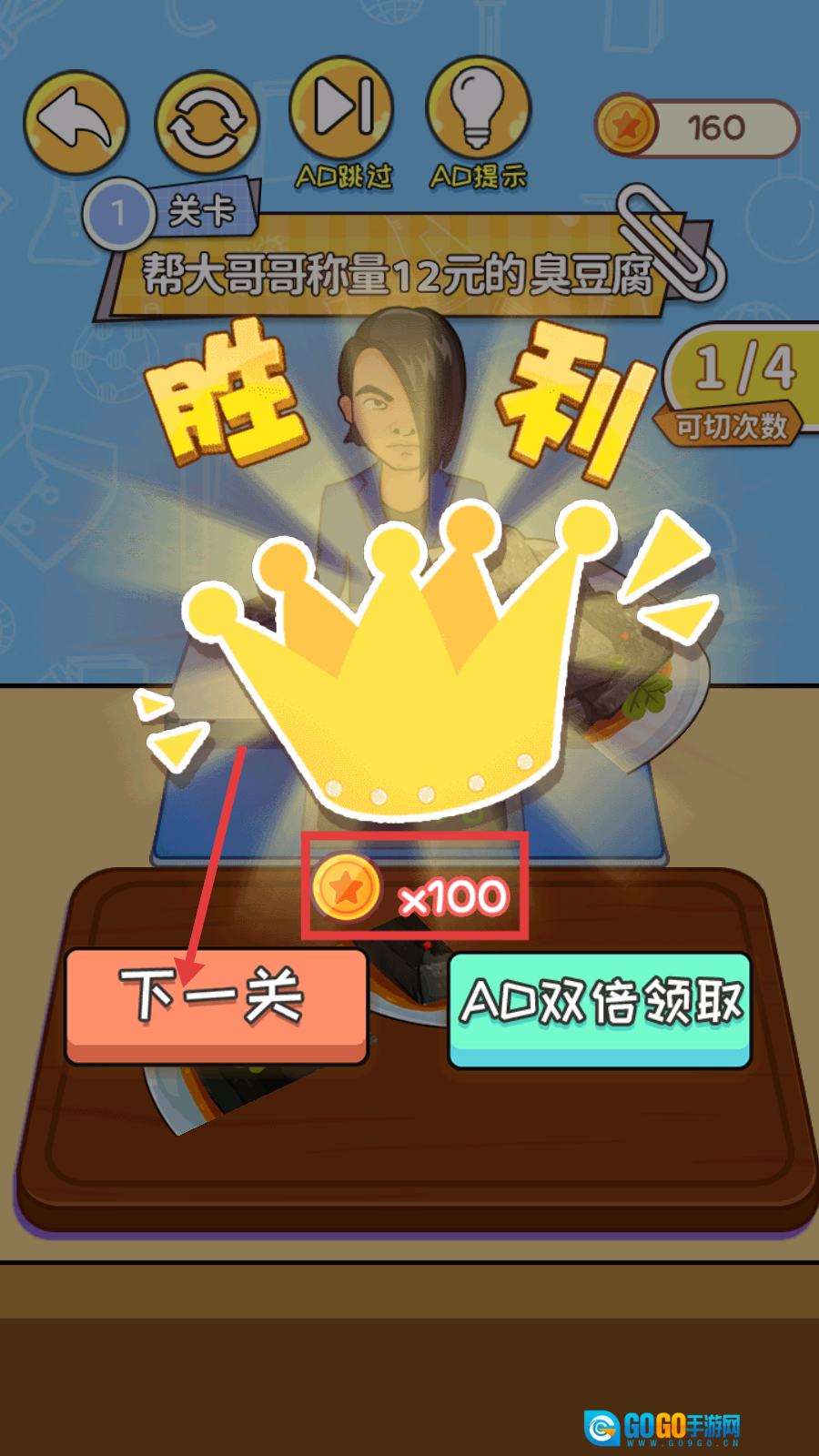 4、通关后获得【金币×100】奖励,点击【下一关】按钮继续挑战,积累金币可用于解锁新关卡或道具。