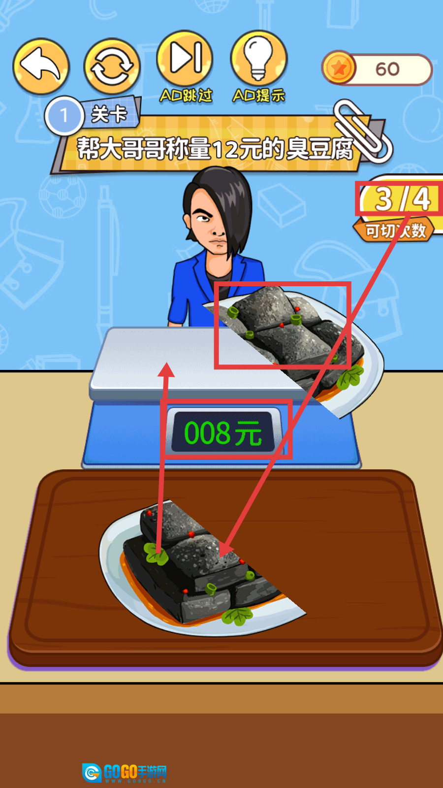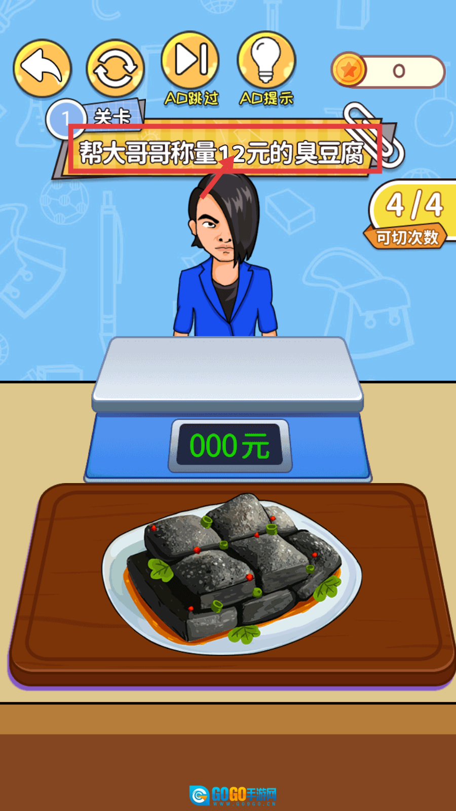 2、在【关卡1】中,任务是【帮大哥哥称量12元的臭豆腐】,观察秤和臭豆腐,准备进行称量操作。
