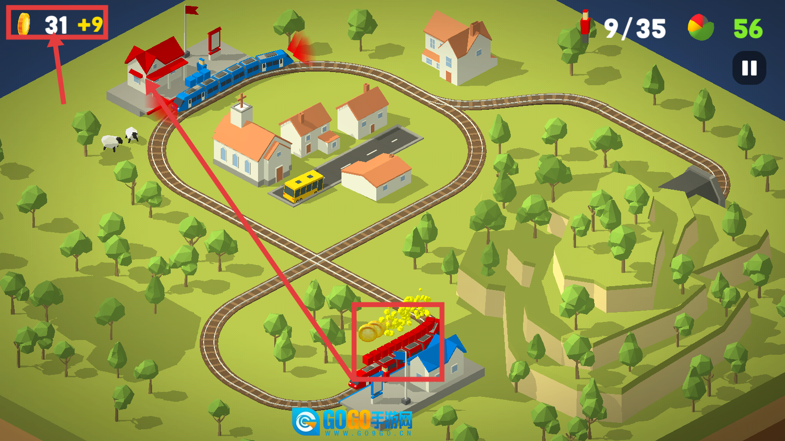2、操控蓝色和红色火车,前往对应车站接送乘客,积累金币【31+9】,开始完成运输次数目标。