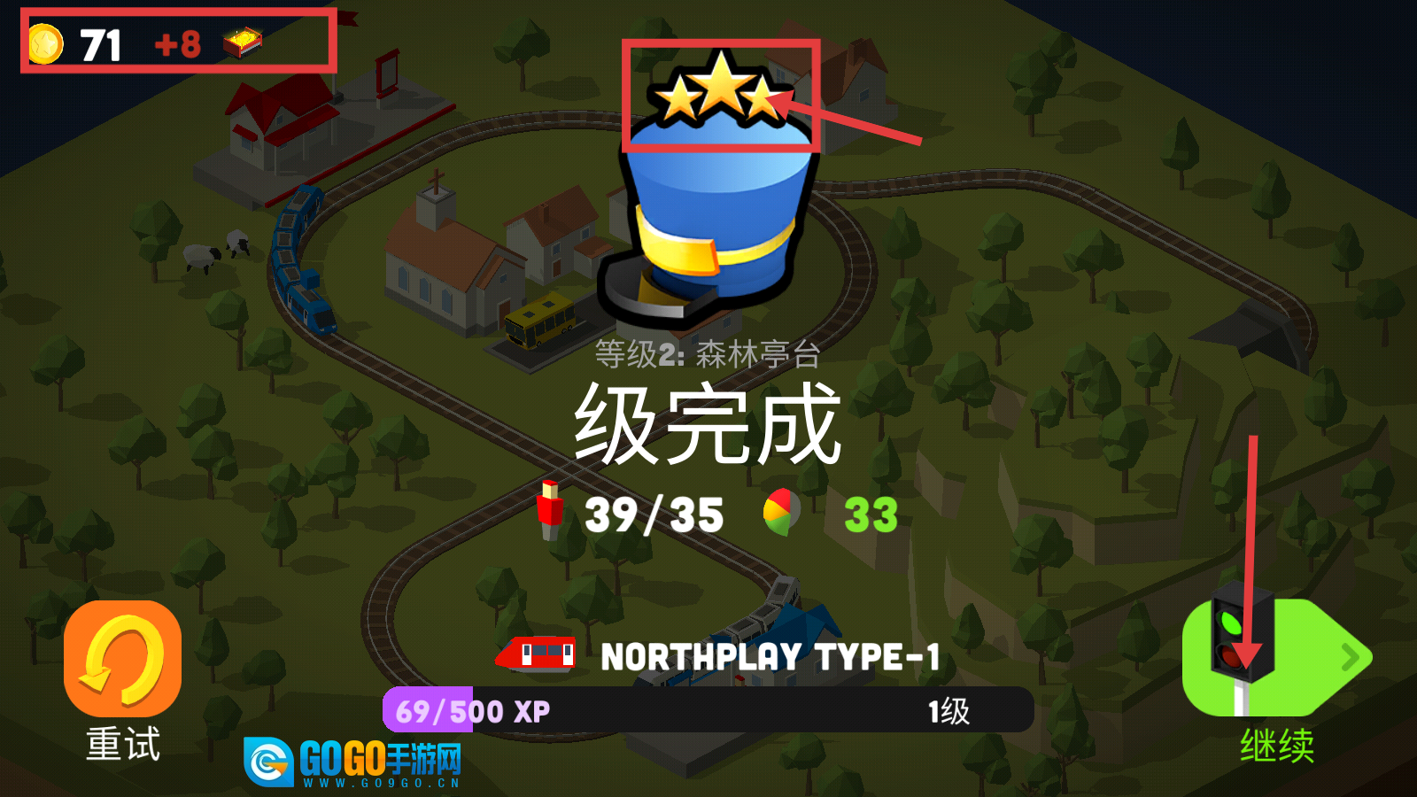 4、关卡完成后,获得【金币71+8】和三星评价,点击【继续】按钮进入下一关,积累资源用于升级火车。