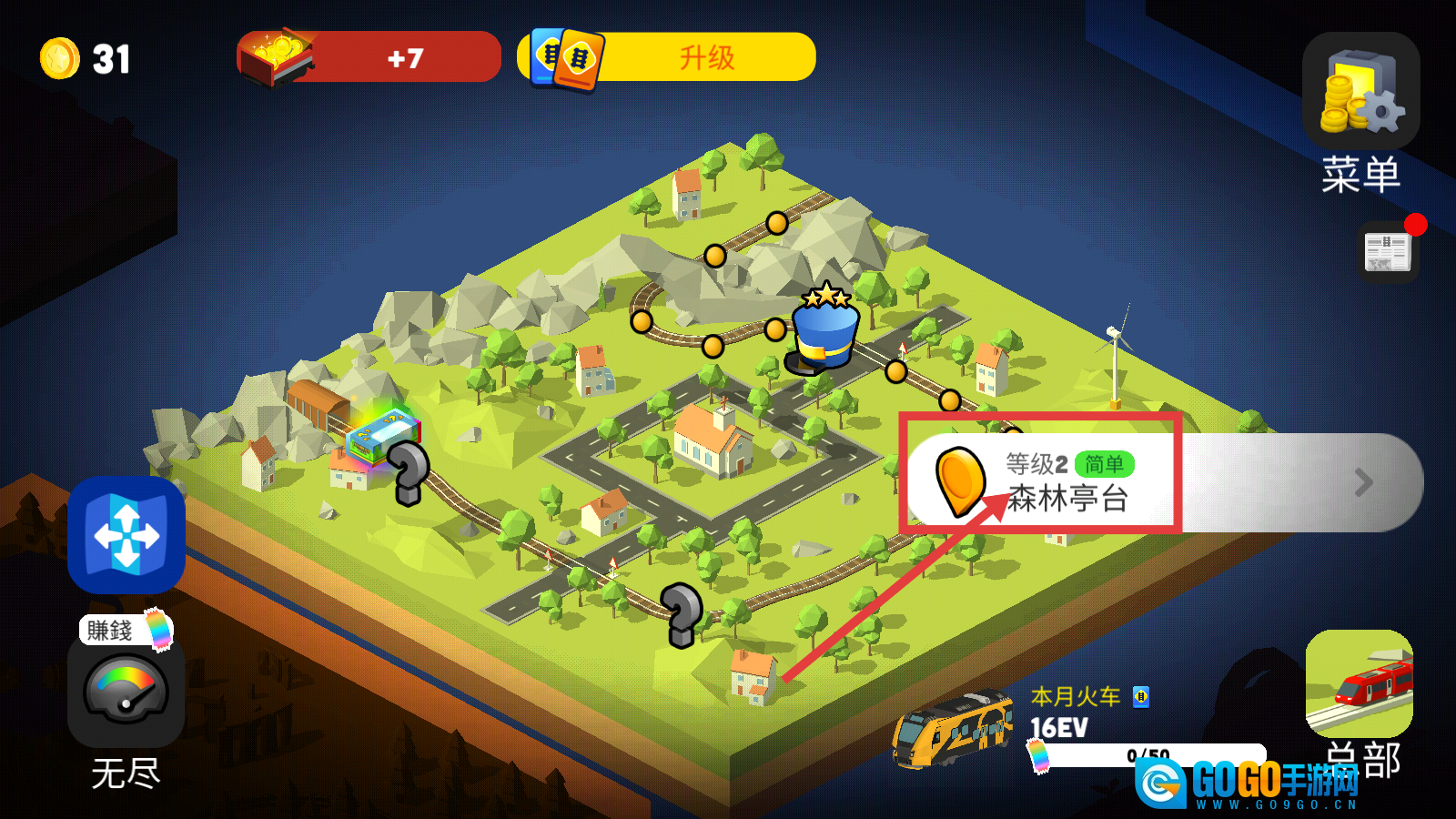 1、点击【等级2-简单-森林亭台】进入关卡,开启火车运输乘客任务,可查看升级、菜单功能,熟悉界面后推进。